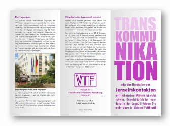 VTF-Werbe-FaltblattHier können Sie sich das aktuelle VTF-Faltblatt herunterladen. Dieses Faltblatt kann bei jeder Gelegenheit verteilt werden, um damit für die Transkommunikation und für den VTF zu werben. Beispielsweise kann man es in esoterischen (und natürlich auch in normalen) Buchhandlungen oder auf Messen auslegen, oder es kann an Freunde und Bekannte weitergegeben werden. Klicken Sie zum Herunterladen der PDF-Datei auf den folgenden Download-Link: Zum Öffnen und Drucken der PDF-Datei wird das kostenlose Programm "Adobe Acrobat Reader" benötigt, das (falls es nicht schon